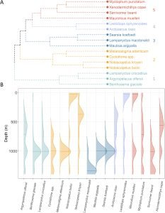 A: Clusters of fish isotopic niche (diet) overlap. B: Vertical nocturnal distribution of 16 species. Colors represent fish having similar diets. (Figure 3, retrieved from Loutrage et al. 2024)