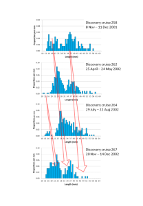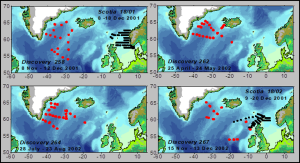 We were poring over mesopelagic fish length distribution data from trawl surveys carried out during MEESO trying to identify annual cohorts of fish in order to estimate their growth trajectories. Then we remembered a set of surveys from 2001/2002 carried out in the Irminger Sea by the research ship Discovery during the UK Natural Environment Research Council’s “Marine Productivity” (MarProd) Programme. This involved 4 surveys, in November/December 2001, April/May 2002, August 2002 and November/December 2002 (FIGURE 1).
