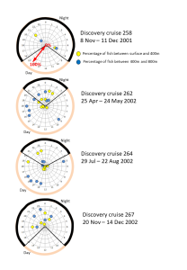 FIGURE 4. Composite data for each survey on the daily vertical distribution patters of the combined Benthosema glaciale and Maurolicus muelleri mesopelagic fish species. Numbers around the periphery of each plot show the time of day (local) at which tows were carried out (local time = UTC – 2.5 hours). The segment outlined in black represents night-time, orange represents day-time). Each tow is represented by a pair of symbols – in yellow the percentage of fish between the sea surface and 400m depth; in blue the percentage between 400m and 800m. The percentage value is indicated by the radial distance from the centre of each plot. Hence, if all fish in a tow were caught between the surface and 400m then the yellow symbol would be located on the outer edge of the plot and the corresponding blue symbol at the centre. We can see that in all the daytime tows in spring and summer the blue symbols are around the periphery – i.e. the majority of fish were located deeper than 400m. There were no day-time tows in the winter surveys. During night-time in spring and summer, the yellow symbols are closer the periphery than the blue symbols indicating that the fish were more aggregated in the surface – 400m layer. In the winter there was no clear pattern of night-time vertical distributions.