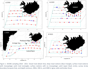 The Marine and Freshwater Research Institute (MFRI) in Iceland explored options for opportunistic sampling of the mesopelagic community during the Icelandic part of the International Ecosystem Summer Survey in Nordic Seas (IESSNS) from 2018 to 2021 (Figure 1a-d). Mesopelagic samples were collected from routine acoustic measurements, trawling, and environmental measurements of IESSNS thus demanding no extra survey time and no extra scientists onboard, i.e. no additional survey cost.