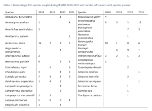During the four sampling years, 33 mesopelagic fish species have been caught (Table 1, Figure 4). Species composition varies between years with only 6 of 33 species caught in all four years. The frozen fish samples will be analysed by several SUMMER partners and contribute data to SUMMER work package (WP) 2, WP3 and WP5. Furthermore, IESSNS sampling has also contributed acoustic data to SUMMER WP2, eDNA samples to WP2, and two SUMMER collaborators, Martina Blumel from GEOMAR and Enrique G.A. Garcia from DTU, joined the survey in 2020 and collected opportunistic fish and zooplankton samples for WP2 and WP5.
