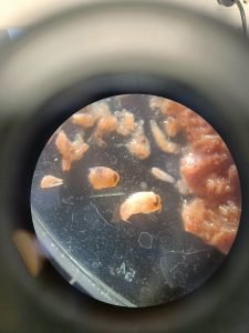 These pictures are examples of what the students found inside the stomachs of their dissected mesopelagic fishes. To the left you can see multiple carapaces of krill, with a visible spike (rostrum) at the ends. To the right you can see pieces of amphipods, recognizable by their large black eyes.