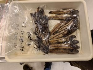 Two bags of fish that were dissected. To the left Lanternfish, and to the right Lancetfish.