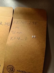These pairs of small white ear stones, are called otoliths. They are part of the fish’s inner ear, and are used for hearing and balance. Otoliths can be used by scientists to figure out the age of a fish - in the same way you can count the annual rings in a tree, you can count the number of rings in an otolith! In addition, otolith shape varies among different species - so that they can be used in species recognition! The pictures above show the otoliths of a lanternfish to the left, and lancetfish to the right. After extraction, the otoliths were stored in the small paper bags. These bags had the fishes length, station, and species number written on them.