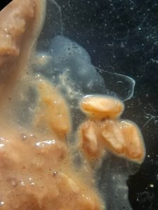 These pictures are examples of what the students found inside the stomachs of their dissected mesopelagic fishes. To the left you can see multiple carapaces of krill, with a visible spike (rostrum) at the ends. To the right you can see pieces of amphipods, recognizable by their large black eyes.