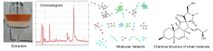 Bioactive extracts are chemically analyzed by liquid chromatography coupled to a mass spectrometer (LC-MS), where each SM in an extract is separated and detected by its molecular mass and fragmentation pattern. Subsequently, MS data are grouped by their spectral similarity and visualized in so-called molecular networks, followed by comparison to chemical databases in order to identify known and detect new molecules; a process called dereplication.