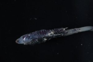 Picture of Argyropelecus hemigymnus, a species known as the “Half-naked hatchetfish”. This name may come from it lacking scales on its tail, appearing half naked! The back dots on its tail are also a main characteristic of this species. (Photo: Joan Angel-Soto)