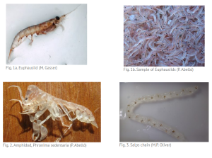 The most relevant taxonomic group among mesopelagic macrozooplankton is that of euphausiid crustaceans, also known as krill (Fig. 1), which may form large schools that daily move up and down from deep to shallower waters, or even to surface waters while descending to deep water in the day where they stay until the following sunset to return to shallower waters to forage during the night. Other taxa such as amphipods (Fig. 2), although being less abundant, are common in mesopelagic samples, and constitute an important prey source for micronekton species [We biologists often differentiate between commonness (based on presence or absence information, and abundance/density, based on number of individuals]. Gelatinous macrozooplankton, represented by salps (Fig. 3), jellyfish and siphonophores (By-the-wind sailor, and others) are common, and sometimes very abundant, in all seas.
