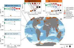 In conclusion they found that the distribution of fish biomass depends on pelagic and benthic secondary production, and is strongly mediated by seabed depth, which (indirectly) controls the amount of detritus reaching the seabed, fish vertical behaviour and fish cross-habitat feeding. The authors show how these forces can be used to simulate fish biomass and feeding interactions across ocean biomes on a global scale, which is useful for predicting fisheries production, and also carbon sequestration