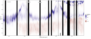 Figure 2. Backscatter difference between 18 kHz and 38 kHz frequencies on a west-to-east transect south of Iceland, latitude 61.85 °N, during IESSNS 2019. Backscatter collected during sampling at stations is excluded (black vertical bands). The transect is approximately 480 nautical miles or 900 km long, begins July 19th at 7 pm and ends July 22nd at 2 am. Vertical sampling depth is 750 m.