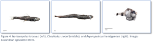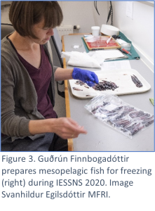 During the four sampling years, 33 mesopelagic fish species have been caught (Table 1, Figure 4). Species composition varies between years with only 6 of 33 species caught in all four years. The frozen fish samples will be analysed by several SUMMER partners and contribute data to SUMMER work package (WP) 2, WP3 and WP5. Furthermore, IESSNS sampling has also contributed acoustic data to SUMMER WP2, eDNA samples to WP2, and two SUMMER collaborators, Martina Blumel from GEOMAR and Enrique G.A. Garcia from DTU, joined the survey in 2020 and collected opportunistic fish and zooplankton samples for WP2 and WP5.